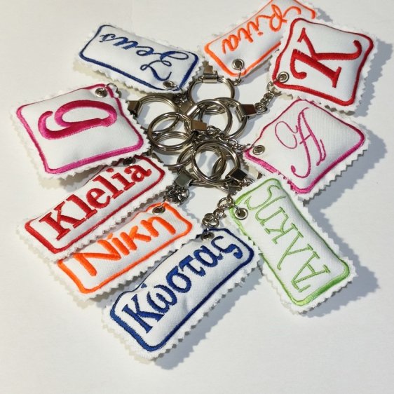 Ανθεκτικό λευκό αδιάβροχο ύφασμα, με κεντημένο το όνομα ή ότι άλλο εσείς θέλετε. Το μπρελόκ αυτό είναι σαν ένα μικρό μαξιλαράκι το οποίο είναι δεμένο μ’ ένα σκληρό μεταλλικό μπρελόκ με κρίκο και αλυσίδα για να βάλετε τα κλειδιά σας. Η διάσταση του είναι 10εκ.*3εκ.