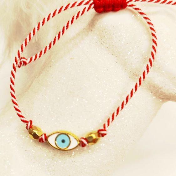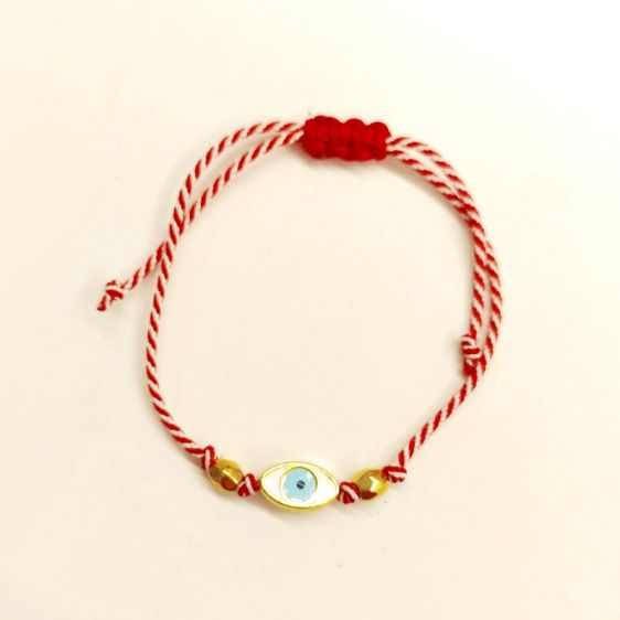 Μαρτάκι Ματάκι χρυσό, ζωγραφισμένο με σμάλτο, πλαισιωμένη με χαντρούλες χρυσές. Ενώ για το κούμπωμα του έχει αυξομείωση με μακραμέ.
