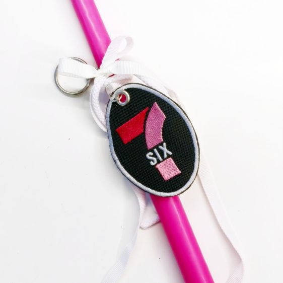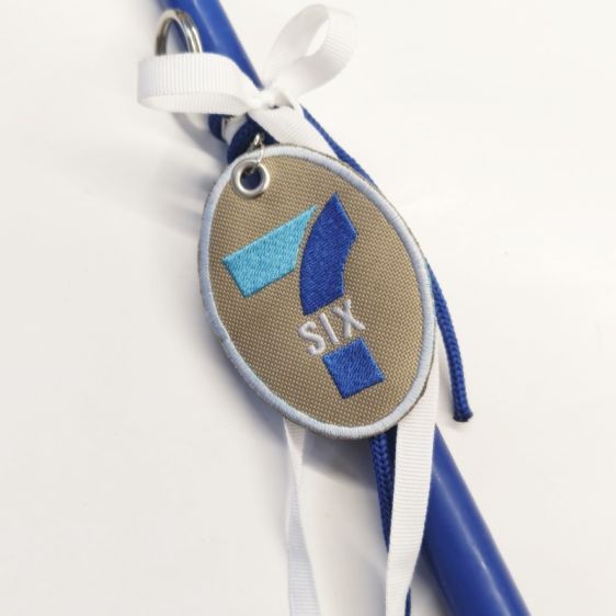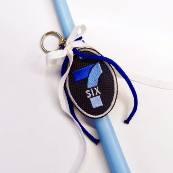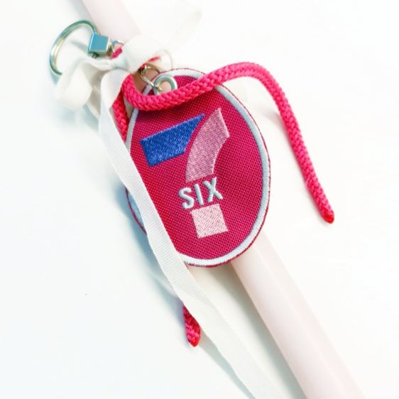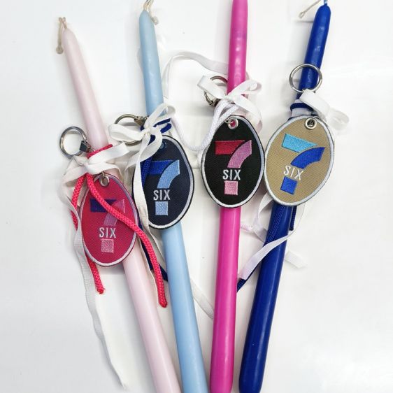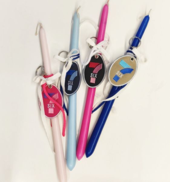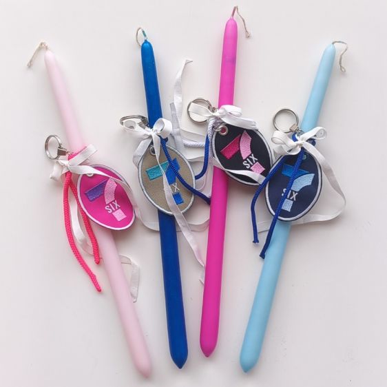 Μια λαμπάδα κλασική (30εκ) σε τέσσερις χρωματισμούς. Με κρεμασμένο ένα μπρελόκ και κέντημα 6 7. Μια λαμπάδα που σίγουρα θα ξεχωρίσει.