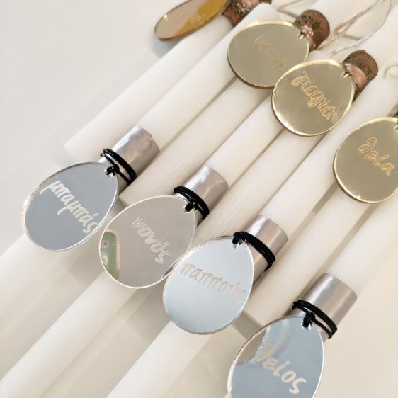 Λαμπάδα κλασική σε χρώμα λευκό αρωματική, διακοσμημένες με ένα plexi glass καθρέφτη χρυσό ή ασημί αυγό με χαραγμένες οκτώ μαγικές λέξεις. “Γιαγιά”- “Παππούς” – “Μαμά” – “Μπαμπάς” – “Νονά” – “Νονός” – “Θεία” – “Θείος”. Λαμπάδα για τις γυναίκες και τους άνδρες που έχουμε αγαπήσει όσο κανέναν άλλον. Ενώ η κορδέλα που είναι δεμένο το αυγό είναι από χρυσή κλωστή και ασημένια. Τα κεριά είναι ύψους 27εκ. και δ.2εκ.