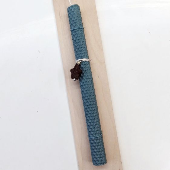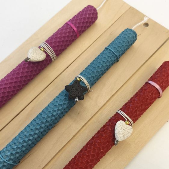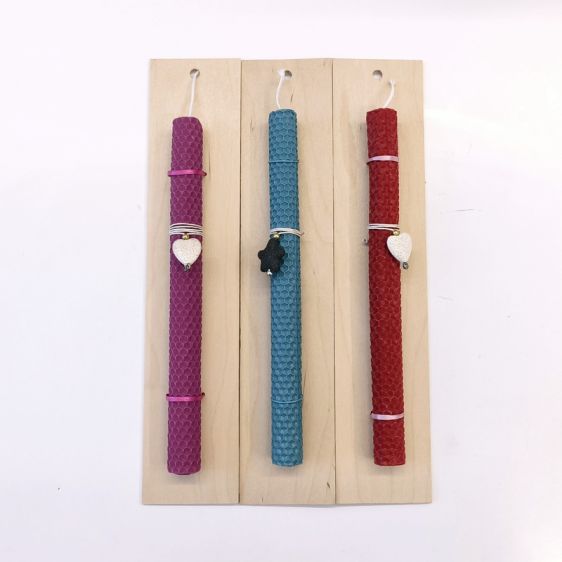 Λαμπάδα από αληθινό Μελισσοκέρι με ένα υπέροχο στοιχείο από ηφαιστειογενές πέτρωμα. Δεμένο πάνω σε μία πλακέ ξύλινη επιφάνεια. Επιλέξτε ανάμεσα στα τρία χρώματα. Το ύψος 27εκ, διαμέτρου 2εκ.