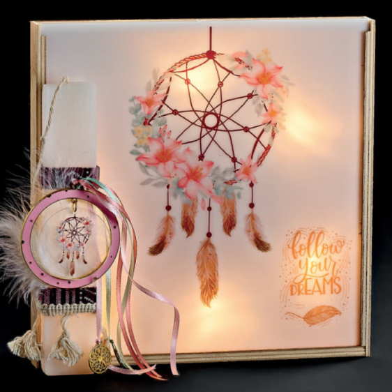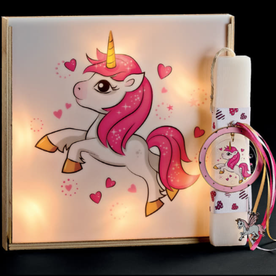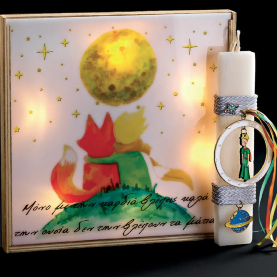 Λαμπάδα μαζί με τετράγωνο φωτιστικό. Και κερί διακοσμημένο ανάλογα με τις υπέροχες ζωγραφιές. Ένα φωτιστικό που συντροφεύει το παιδί στο δωμάτιο του όλο τον χρόνο.  Το ύψος του κεριού είναι 20εκ, και το φωτιστικό έχει διάσταση 25* 25εκ.