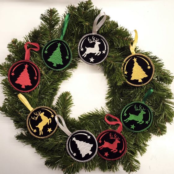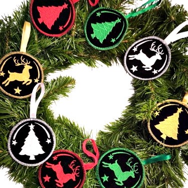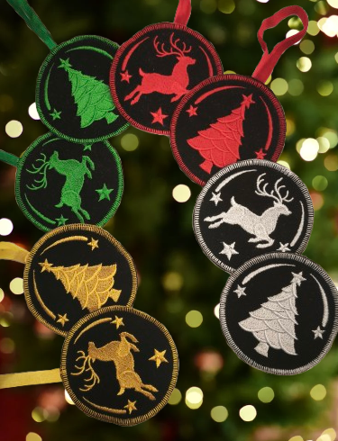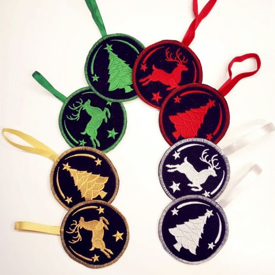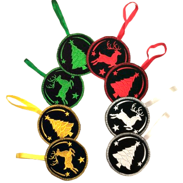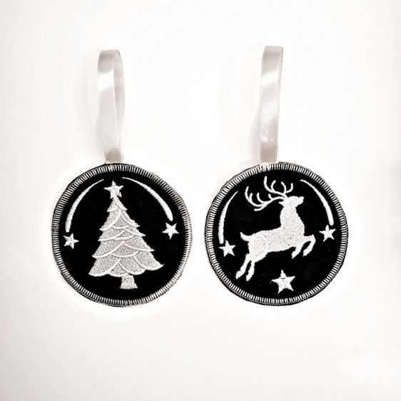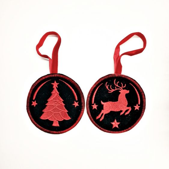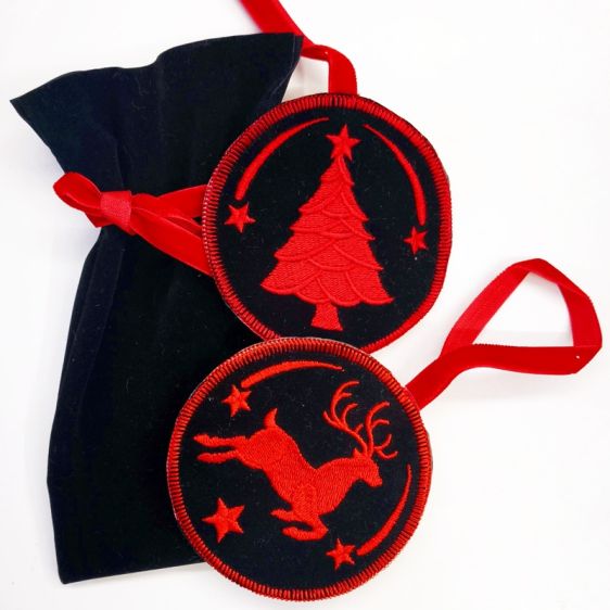 2 Βελούδινα στολίδια με δύο υπέροχα κεντήματα. Διαμέτρου 10εκ. Μέσα στο δικό τους πουγκί. Επέλεξε ένα από τους τέσσερις χρωματισμούς. Χρυσό , ασημί, κόκκινο και πράσινο. Για να ένα ξεχωριστό, μοναδικό και ιδιαίτερο δείπνο.