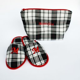 Ένα δώρο με πολύ αγάπη για τους πρίγκιπες της ζωής μας. Σετ νεσεσέρ και παντόφλες με κεντημένα τα μονογράμματα τους. Το νεσεσέρ έχει διάσταση 23εκ. το φάρδος του, το ύψος του 13εκ. και το πλάτος του 11εκ. Αρκετά μεγάλο για να χωράει όλα τα αυτά που χρησιμοποιούν οι άντρες. Οι παντόφλες στο ίδιο καρώ για να συνδυάζονται με το νεσεσέρ. Το μέγεθος τους είναι 43-45. Σίγουρα αυτό το δώρο θα του μείνει αξέχαστο.